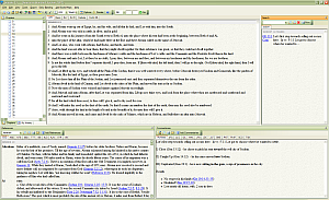 BiblePro offers basically 5 panes. A small Bible chapter tree view and a Search results view on the top left and right, respectively. The Bible view is in the top middle. The bottom left is the Dictionary/Reference view, and the bottom right is the Commentary view. Each pane, except the Bible pane, can be undocked and moved around at will, and arranged to your hearts content. The panes all have push-pins, which allow you to lock them in place, or let them scroll out of view when not using them.