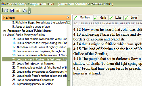 BiblePro does provide a Gospel Comparison Tool. This is actually what is normally called a "harmony", which is a book, article, or document that compares stories in the new testament across all the gospels. Most of the software packages have one or more harmonies, but they usually take the form of a book. BiblePro's GCT is actually a window that pops up listing all the events of Jesus' life. It shows four tabs, one for each gospel, each containing that gospel's account of whatever story you selected. The tab will show a green checkmark or a red x, depending on whether the story appears in that particular gospel. While this works to a point, I think a harmony is much more effective when you can actually view the narratives side-by-side. That is how most software products do it, and for good reason.