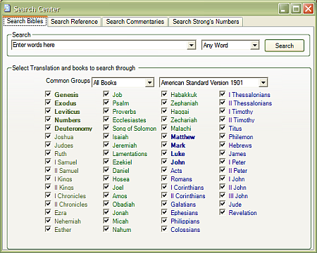A Power Search is also available. Here you can choose which books, or groups of books, that you wish to search through. You can search all words, any of the words, or exact phrase, but more advanced searches using AND and OR is not available. The Power Search has separate tables for Bibles, References, Commentaries, and Strong's. In other words, you cannot search for a word or phrase across those four main categories, which is extremely limiting. Not only that, under the Commentary search you can only search one commentary at a time. Not what I would call a "Power" search.