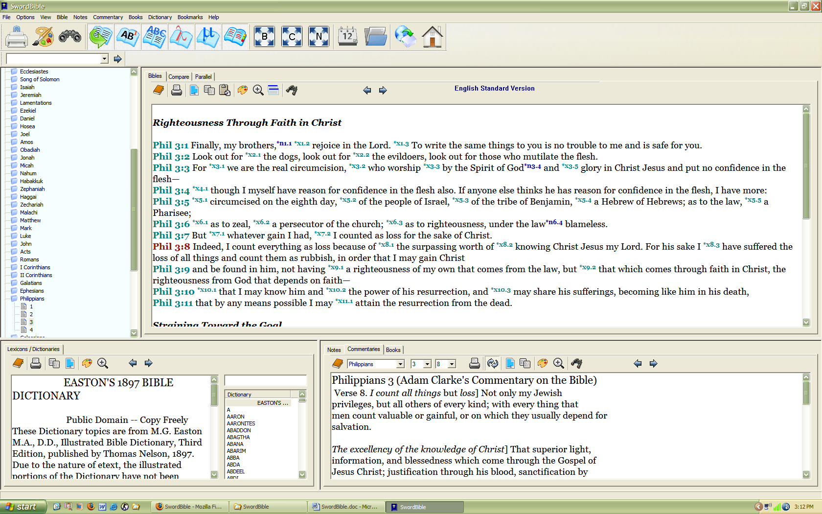 The program started with the Bible pane maximized. I chose the “Normal” display, which shows all the panes, and dropped the font