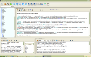 tree on the top left, the Bible pane taking up most of the rest of the top half of the screen, dictionary/lexicons on the lower