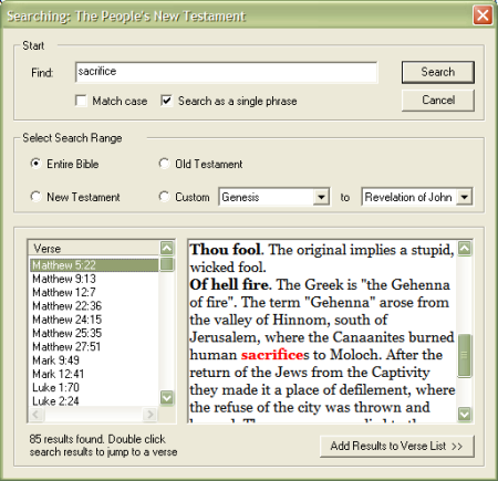 are very basic. You enter a word or a phrase, select a range of Bible books and/or verses, and let ‘er rip. The results